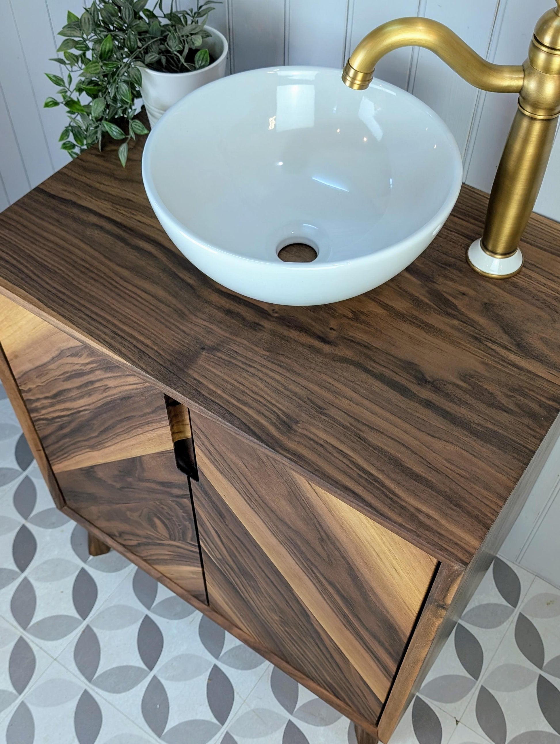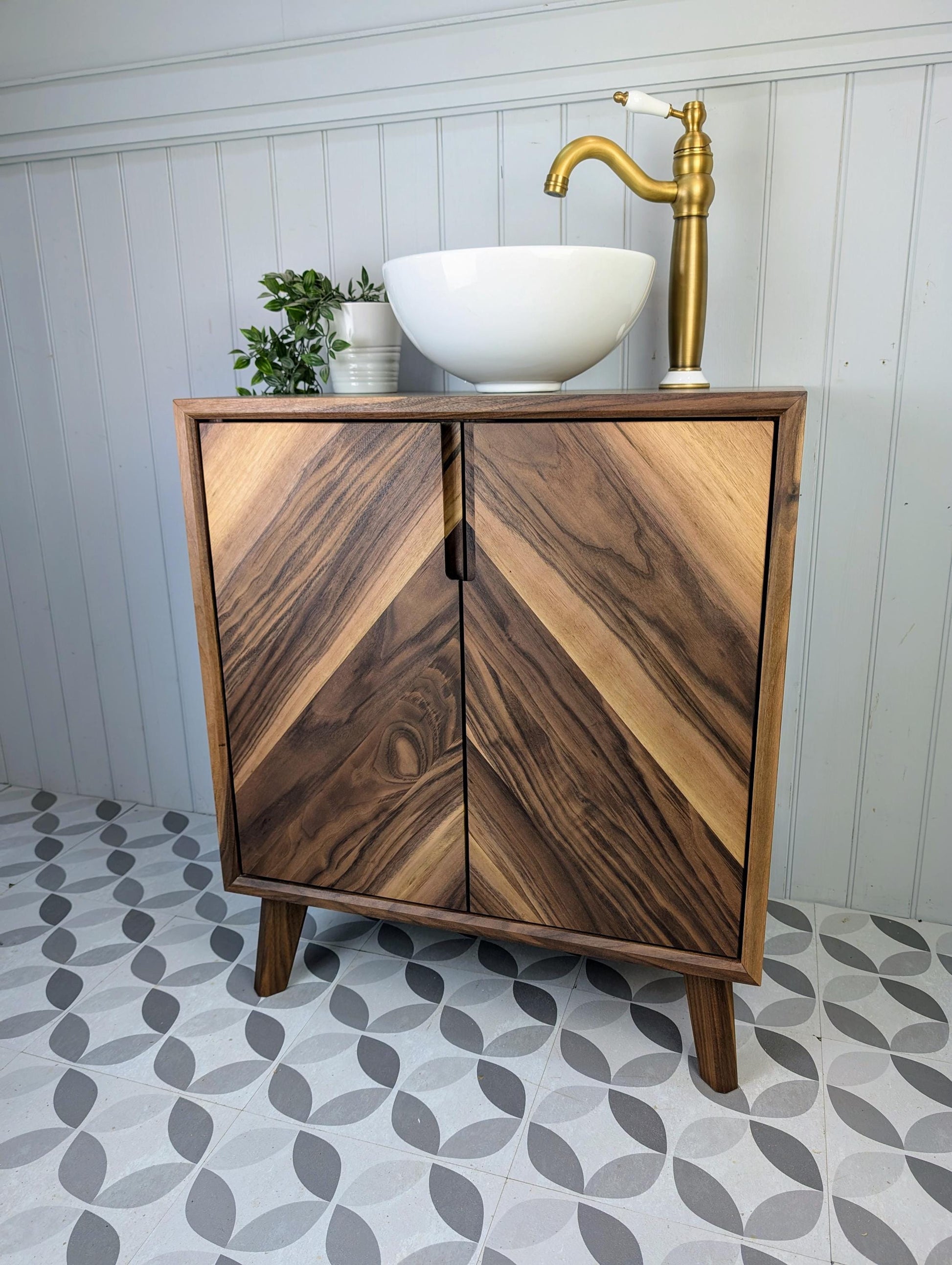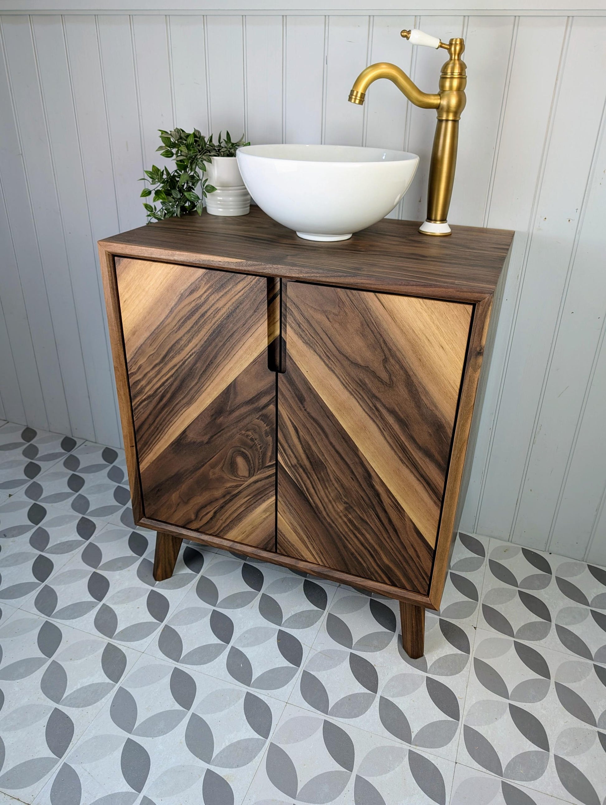 This stylish yet robust bathroom vanity unit has been handcrafted using traditional carpentry methods in our small workshop. This truly one of a kind piece has been made from fully certified FSC Grade A American Black Walnut...... with Chevron doors, waterfall edges, soft close Blum hinges and Pewpew legs, this will absolutely be the focal point in your new bathroom.