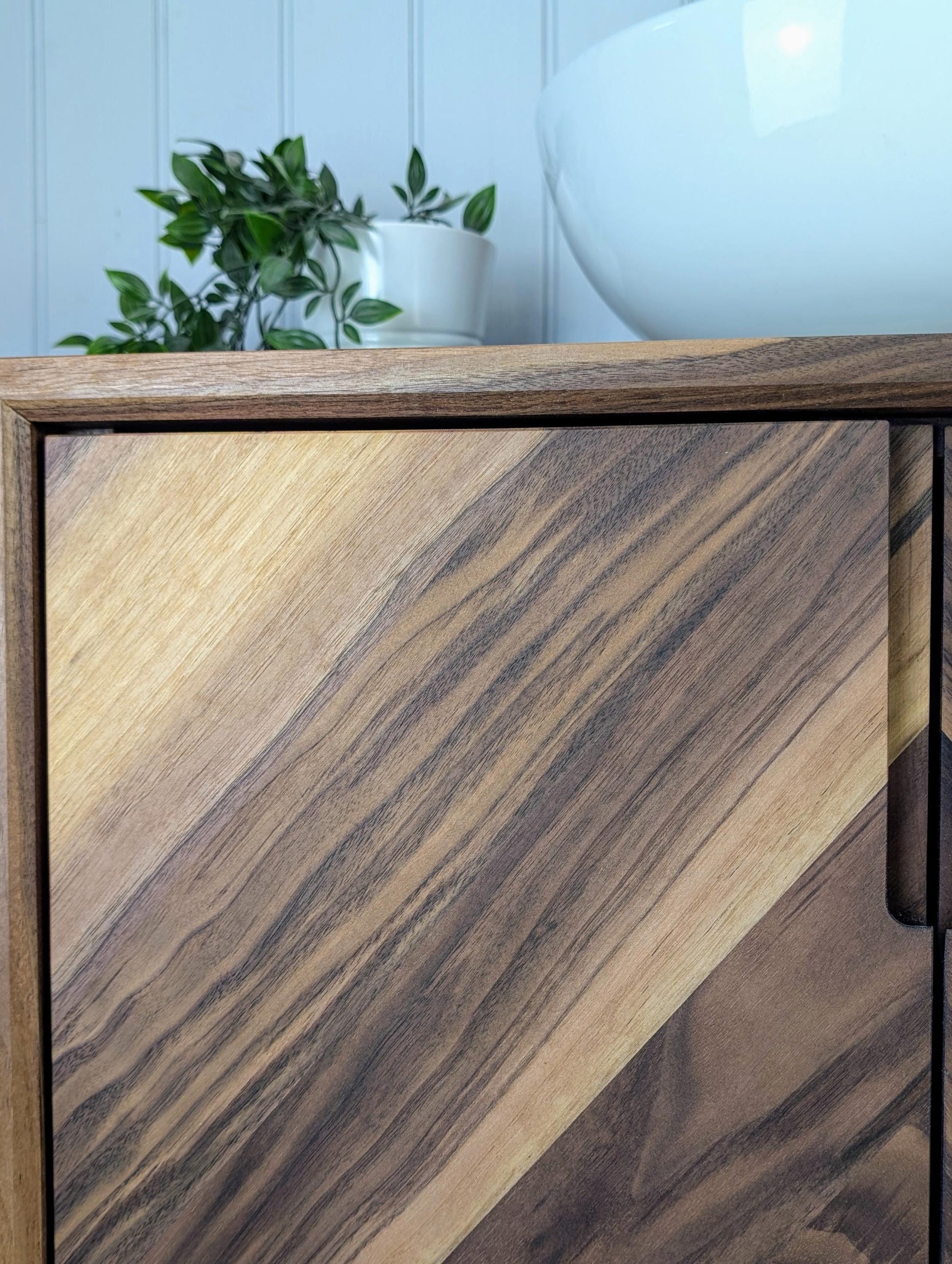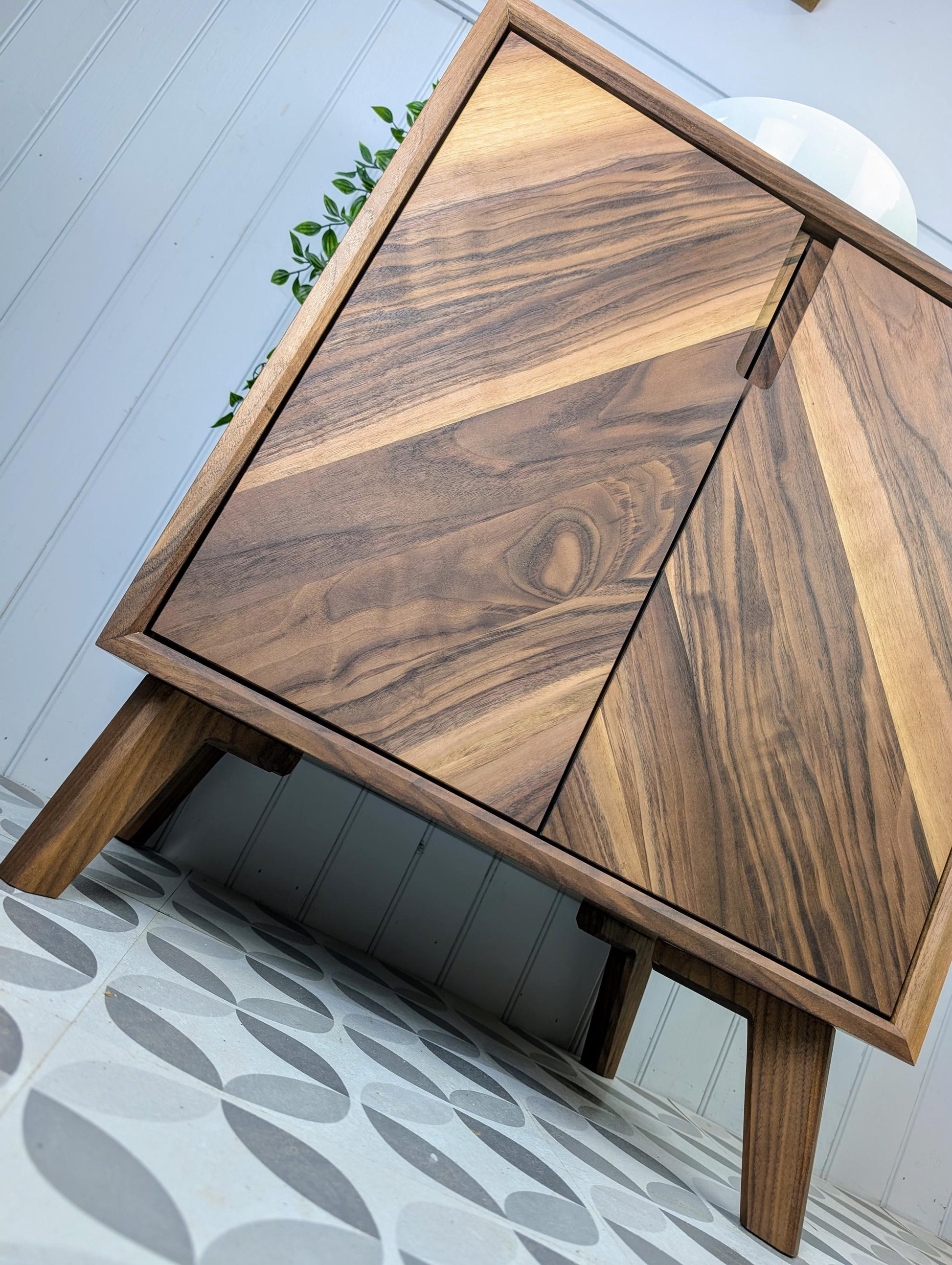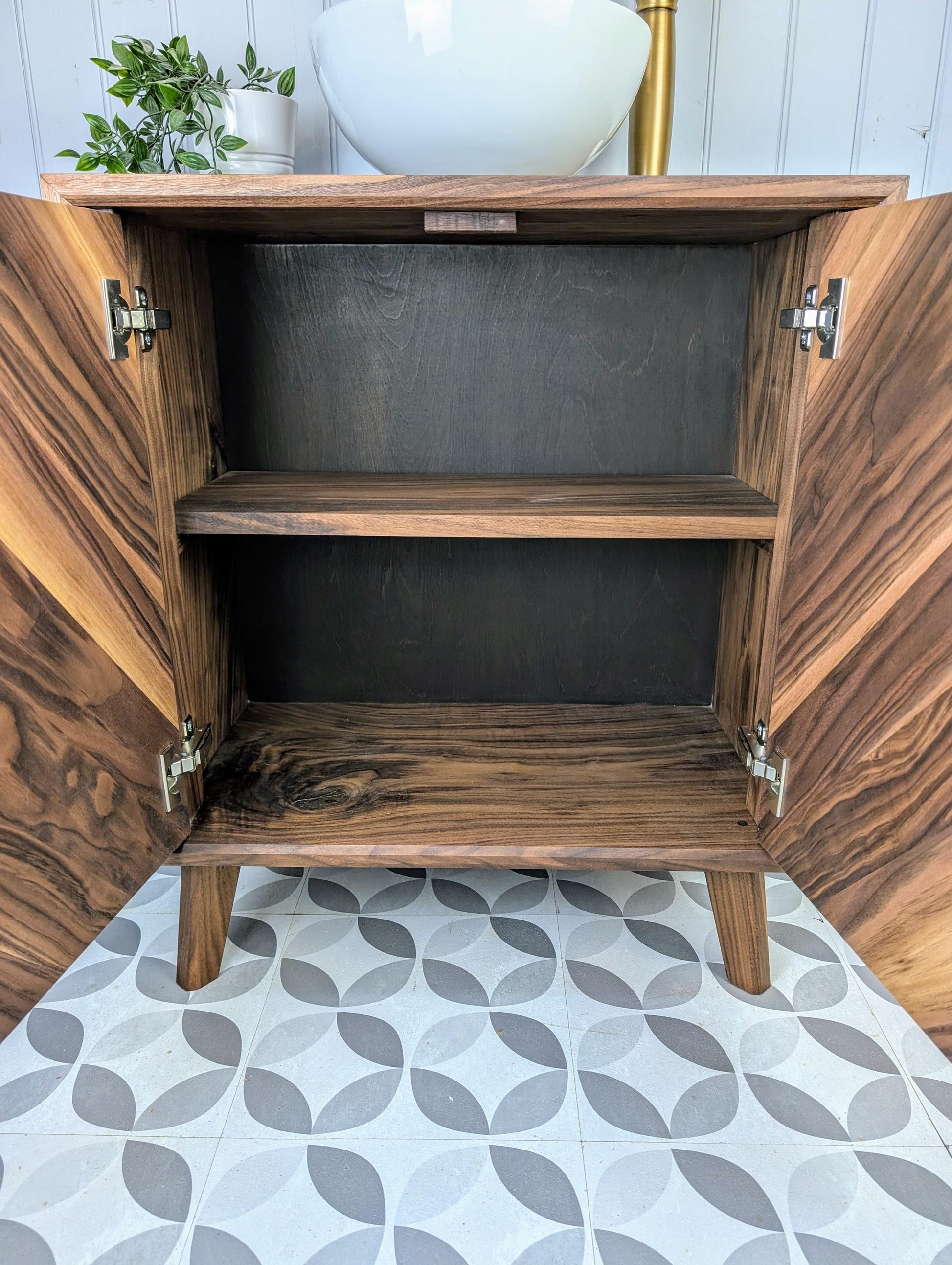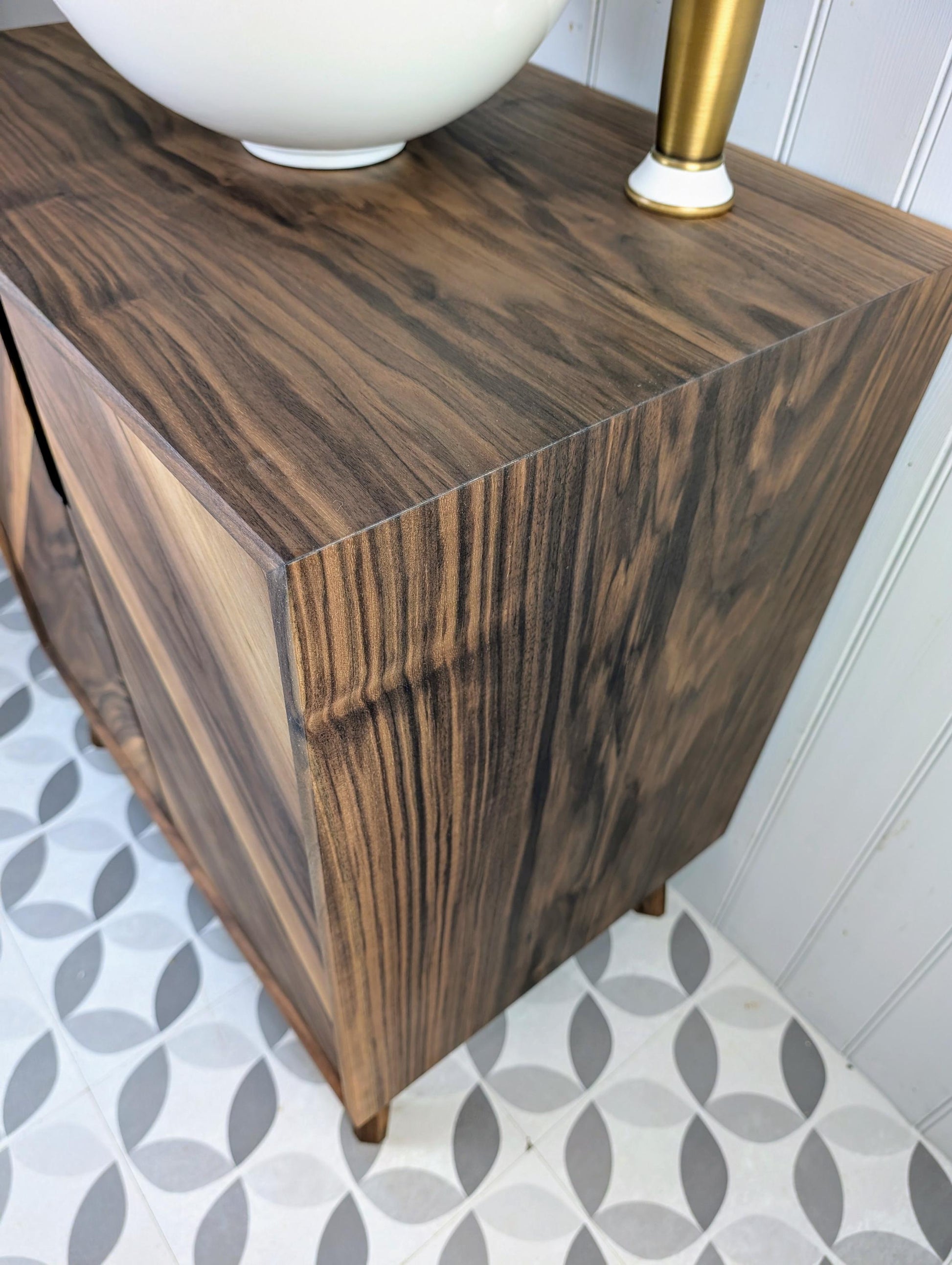 This stylish yet robust bathroom vanity unit has been handcrafted using traditional carpentry methods in our small workshop. This truly one of a kind piece has been made from fully certified FSC Grade A American Black Walnut...... with Chevron doors, waterfall edges, soft close Blum hinges and Pewpew legs, this will absolutely be the focal point in your new bathroom.