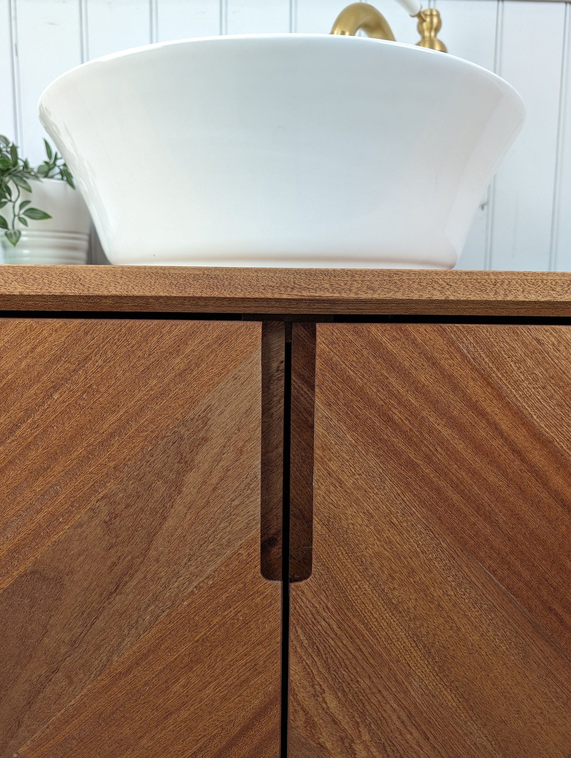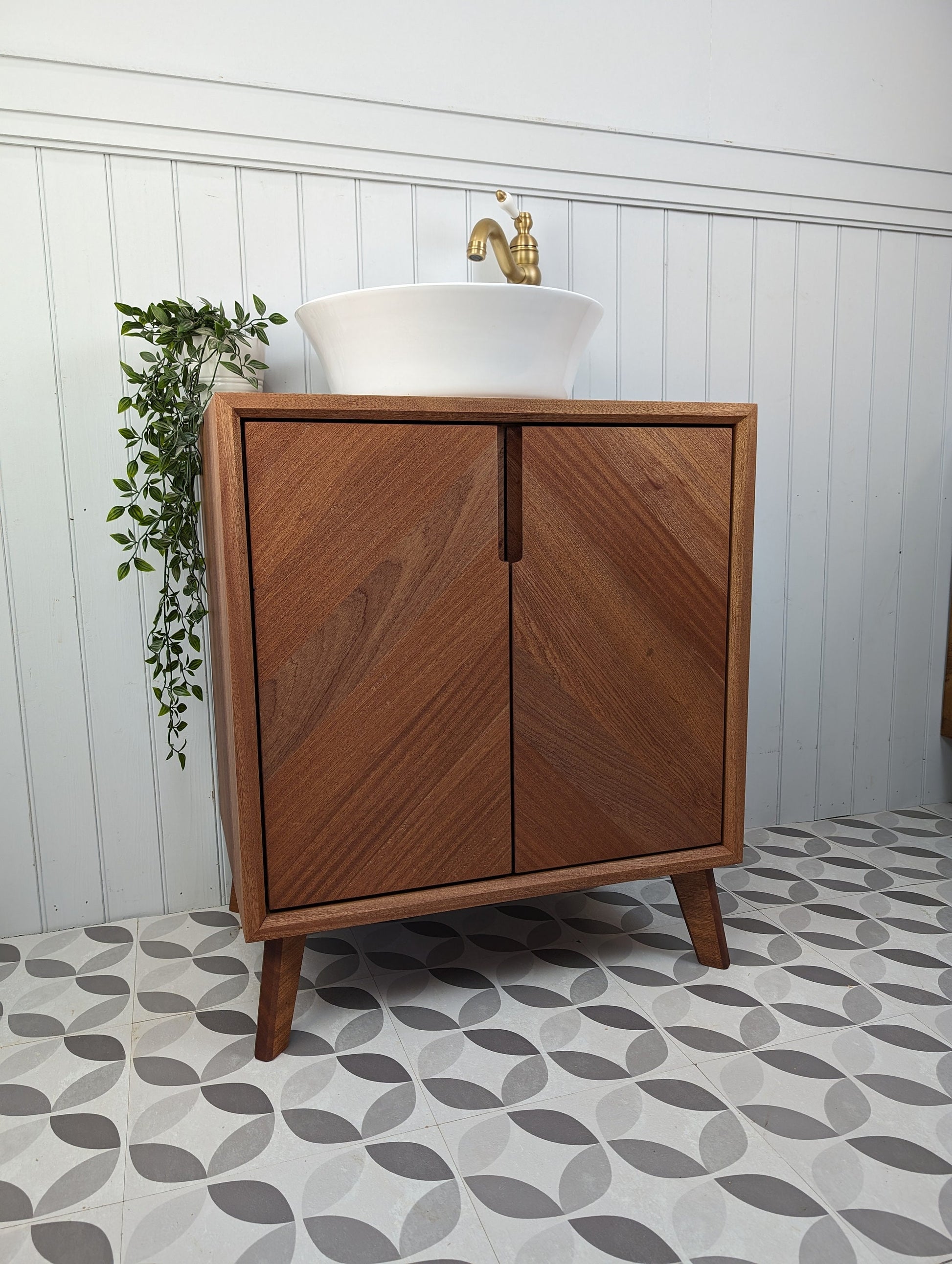 This stylish yet robust bathroom vanity unit has been handcrafted using traditional carpentry methods in our small workshop. This truly one of a kind piece has been made from fully certified FSC Grade A West African Sapele ...... with Chevron doors, waterfall edges and splayed tapered legs, this will absolutely be the focal point in your new bathroom.
